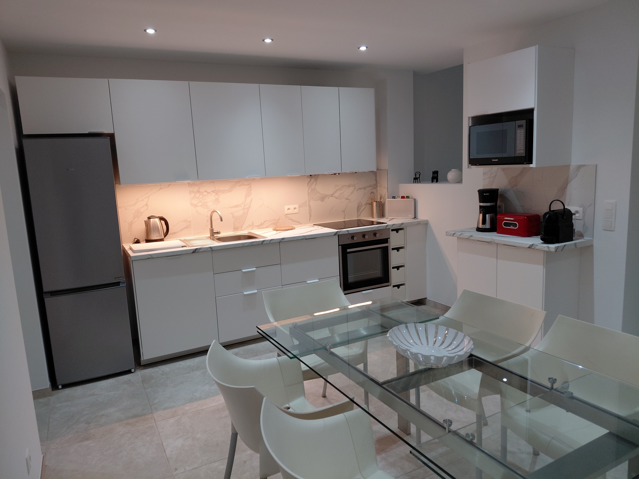 Tout l'équipement : vaisselle, ustensiles, couverts, casseroles, bouilloire, machine à café, toaster, presse-fruits, mixeur/batteur, aspirateur, fer a repasser, planche a repasser,sèches cheveux.